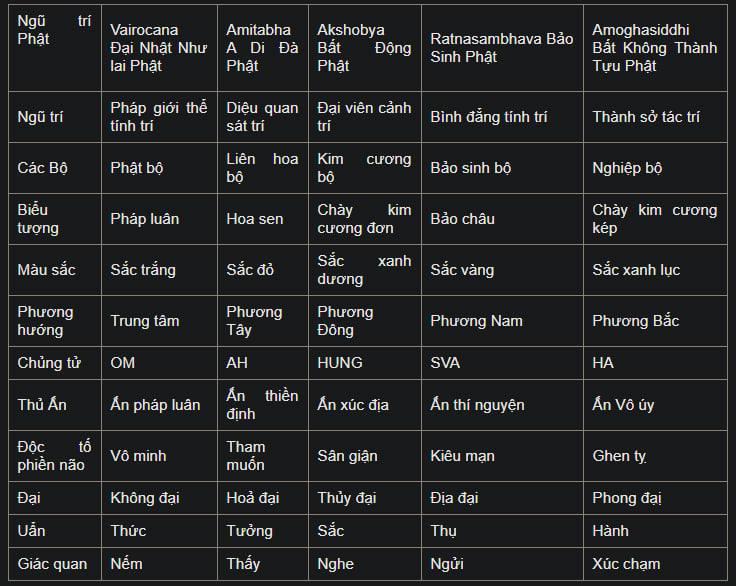 Mỗi bộ trong số 5 bộ Phật bao gồm một Đức Phật trung tâm, đại diện cho một trong 5 uẩn đã tịnh hóa và một Phật Mẫu tượng trưng cho một trong 5 đại đã được tịnh hóa. Bên cạnh đó, 4 trong số 5 bộ Phật đều có các vị Bồ Tát đứng ở xung quanh, tượng trưng cho 6 căn, 6 thức đã được tịnh hóa. 6 vị Phật lần lượt tương ứng với 6 loại trí tuệ: