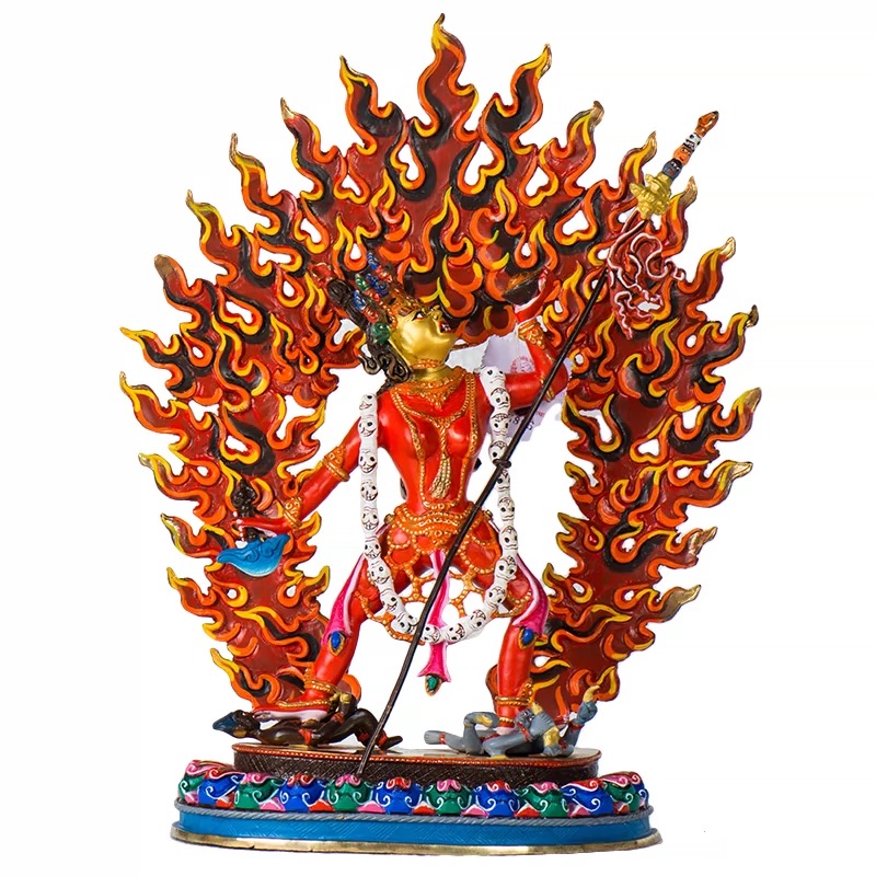 Bà là một người trẻ trung, ở trần và nhiệt thành với Pháp. Thân bà màu đỏ tươi và bà đeo chiếc vòng đầu lâu của 51 người biểu tượng cho sự làm chủ các sự kiện tinh thần. Chân phải co lại và chân trái duỗi rộng đứng trên một cái xác chết. Một chiếc khatvanga được đặt trên vai trái bà.
