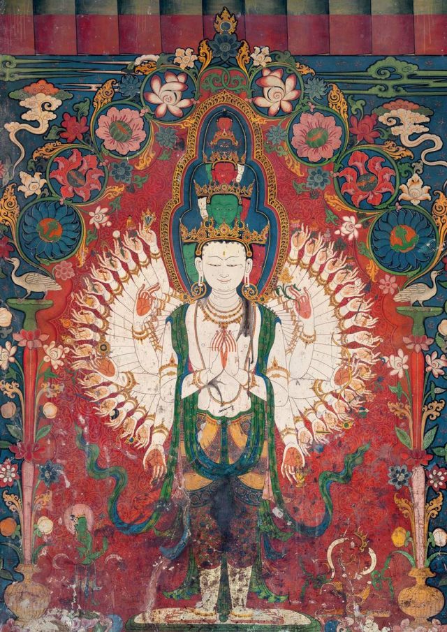 Phật A Di Đà (Amitabha) một trong 5 vị Phật ( Tỳ Lô Giá Na Phật, Bảo Sanh Phật, Khai Phu Hoa Vương Phật , A Di Đà Phật, Thiên Cổ Lôi Âm Phật-nd ) ghép những mảnh vỡ lại, và biến thành 11 đầu. Sau đó ngài dặn dò đức Avalokiteshvara hãy thực hiện lại lời nguyện đó một lần nữa, nhưng giữ lời nguyện đó tốt hơn, kiên cố hơn. Do đó Avalokiteshvara có mười một đầu, và trong đó có mười đầu là hiền hoà và một đầu là phẫn nộ. Đầu phẫn nộ đó chính là đại diện cho Mahakala.